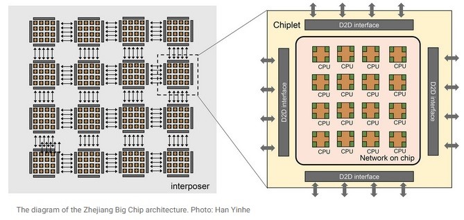 ژجیانگ مساحتی به اندازه هزاران میلی متر مربع را پوشش می‌دهد و از ۱۶ چیپلت با ۲۵۶ هسته تشکیل شده است. به گفته محققان این تراشه می‌تواند تا ۱۰۰ چیپ‌لت، معادل ۱۶۰۰ هسته در مجموع را مقیاس‌بندی کند.