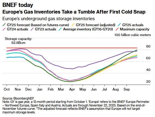 ذخایر گاز در شمال‌غرب اروپا، اسپانیا، ایتالیا و اتریش در پایان ماه نوامبر به ۷۷ درصد رسیده، یعنی ۸ درصد کمتر از مدت مشابه سال گذشته، پس از آنکه موج سرمای اخیر برداشت گاز را افزایش داد.
