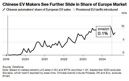 این کاهش از ژوئیه، زمانی که اتحادیه اروپا تعرفه‌های موقتی را بر خودروهای برقی ساخت چین وضع کرد، ادامه داشت و هزینه واردات را به ۴۵ درصد رساند. بزرگترین بازنده تا به امروز MG بوده اکنون بخشی از SAIC دولتی چین است. این اتحادیه بالاترین تعرفه‌های اتحادیه اروپا را به همراه ۳۵ درصد اضافه بها بر ۱۰ درصد تعرفه وارداتی آن اعمال کرد.