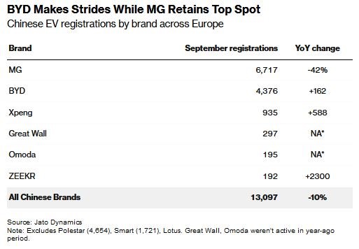 به گزارش بلومبرگ، برندهای چینی در ماه سپتامبر ۸٫۵ درصد از تحویل خودروهای برقی را در سراسر منطقه اروپا در اختیار داشتند که در مقایسه با ۹٫۶ درصد در دوره قبل از آن، کاهش داشته است. واحد MG متعلق به خودروسازی سایک با کاهش ۴۲ درصدی در فروش پیشتاز این افت بود.