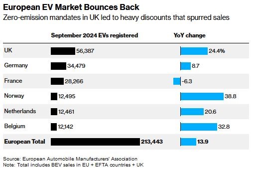بر اساس داده‌های انجمن خودروسازان اروپا، در سراسر اروپا، فروش خودروهای باتری‌دار توسط همه تولیدکنندگان در ماه سپتامبر ۱۴ درصد افزایش یافته است. این امر باعث شد که بخش خودروهای برقی نقطه درخشانی در بازار خودرو در حال رکود باشد.