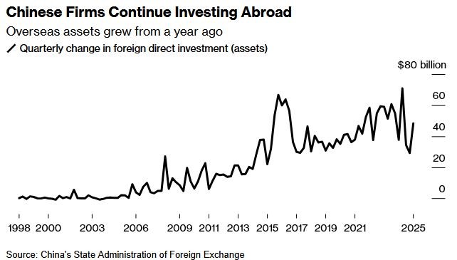 به گزارش بلومبرگ و به نقل از اداره دولتی مبادلات ارزی چین (SAFE)، شرکتهای چینی در سهماهه نخست سال جاری حدود ۴۸ میلیارد دلار به داراییهای بینالمللی خود افزودند. این رقم نسبت به دوره مشابه در سال ۲۰۲۴، افزایشی ۲۸ درصدی نشان میدهد.