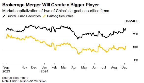 به گزارش بلومبرگ، شرکت گوتای جونان (Guotai Junan Securities) با شرکت هایتونگ سکیوریتیز (Haitong Securities) از طریق مبادله سهام ادغام خواهد شد. ترکیب این شرکتها که هر دو تا حدی متعلق به مدیر داراییهای دولتی شانگهای هستند، یک نهاد جدید با داراییهای ۱٫۶ تریلیون یوان (۲۳۰ میلیارد دلار) ایجاد میکند که در صدر شرکت Citic Securities به عنوان بزرگترین کارگزاری چین قرار میگیرد.