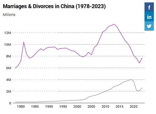 بر اساس آخرین سرشماری چین، تعداد افراد مجرد بین ۲۰ تا ۴۹ سال در این کشور در سال ۲۰۲۰ به ۱۳۴ میلیون نفر رسید که بیشتر از کل جمعیت ژاپن است. بر اساس دادههای وزارت امور مدنی چین، ثبت ازدواج در این کشور در طول دهه گذشته تقریباً به نصف کاهش یافته است و تنها ۴٫۷۵ میلیون زوج در سه فصل اول سال جاری ازدواج کردهاند که پایینترین رقم تاریخی است.