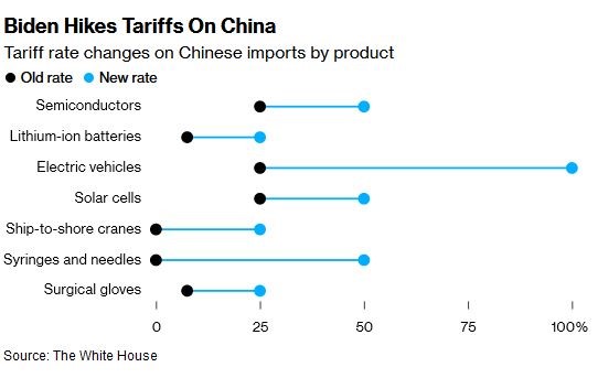 تعرفه خودروهای برقی از ۲۷٫۵ درصد به ۱۰۲٫۵ درصد افزایش یافته است. و تعرفه برخی از فولاد و آلومینیوم از چین – که در حال حاضر با تعرفه ۰ درصد یا ۷٫۵ درصد مواجه است – در سال جاری به ۲۵ درصد افزایش خواهد یافت.