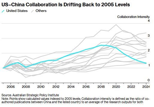 به گزارش بلومبرگ، بر اساس «رصدگر فناوری‌های حیاتی» مؤسسه استرالیایی سیاست راهبردی (ASPI)، تنها یک‌چهارمِ همکاری‌های پژوهشی چین شامل پژوهشگران آمریکایی است؛ در حالی که این رقم یک دهه پیش بیش از نیمی از کل همکاری‌ها بود. این گزارش که بیش از ۷ میلیون مقاله در ۷۴ حوزه فناوری حیاتی را بررسی کرده، نشان می‌دهد شدت همکاری پژوهشی، یعنی سهم آثار مشترک نسبت به کل خروجی پژوهشی به سطح سال ۲۰۰۵ بازگشته است.