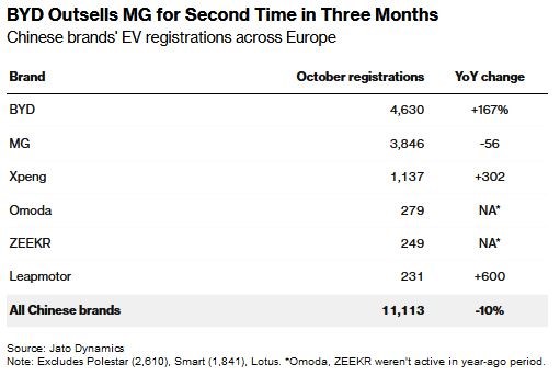 به گزارش بلومبرگ، اتحادیه اروپا بر اساس بررسیهایی که در مورد مقدار یارانه دولتی خودروسازان انجام داده و با توجه به عوامل مختلف (از جمله سطح همکاری آنها با بازرسان)، تعرفههایی به میزان حداکثر ۴۵ درصد بر EVهای چینی وضع نموده، و آماده است تا با برخی از این خودروسازان (بهویژه آنهایی که مایل به تولید بعضی از محصولاتشان در اروپا هستند) در این مورد مذاکره کند.