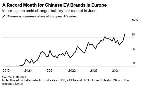 برندهای چینی 11 درصد از بازار خودروهای برقی اروپا را در ماه ژوئن تصاحب کردند و رکوردهای ثبت نامی این منطقه را به دست آوردند؛ زیرا تولیدکنندگان برای شکست تعرفه‌های سخت اتحادیه اروپا که به تازگی اجرایی شد، با یکدیگر رقابت کردند.