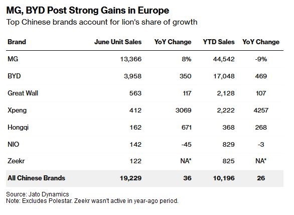 آمارها نشان می‌دهد برندهای چینی بیش از ۲۳ هزار خودروی برقی با باتری را در سراسر اروپا در طول ماه ثبت کرده‌اند که بیشترین میزان در تاریخ بوده است. جهش متوالی ۷۲ درصدی آن‌ها از ماه مه، دو برابر ثبت‌نام کلی خودروهای برقی اروپایی در ماه ژوئن بود. واردات خودروهای ساخت چین از تولیدکنندگان غربی از جمله Volvo Car AB، BMW AG  و Tesla Inc. نیز مشمول عوارض جدید هستند.
