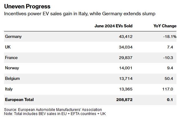 یکی دیگر از محرک‌های بازار خودروهای برقی اروپا در ماه ژوئن، ارائه مشوق‌هایی در ایتالیا بود که به افزایش دو برابری فروش باتری‌های الکتریکی در این کشور نسبت به یک سال پیش کمک کرد. دولت ایتالیا در بیانیه‌ای اعلام کرد حدود ۲۰۰ میلیون یورو یارانه خودروهای برقی جدید آن در کمتر از ۹ ساعت به اتمام رسید که حدود ۶۰ درصد آن توسط خانواده‌ها و بقیه توسط شرکت‌ها مورد استفاده قرار گرفت.
