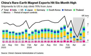 جریان صادرات آهن‌ربا‌های خاکی کمیاب چین به آمریکا در ماه ژوئیه به روند بهبودی خود ادامه داد و حجم صادرات با رشد ۷۶ درصدی نسبت به ماه قبل افزایش یافت؛ این امر پس از آن بود که پکن در چارچوب آتش‌بس تجاری با واشنگتن موافقت کرد که صادرات را به حالت عادی بازگرداند.