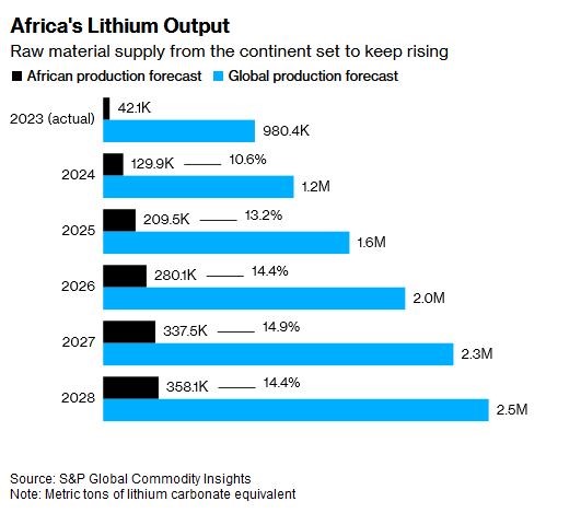 در حالی که انتظار میرود استرالیا، شیلی و چین حدود ۷۰ درصد از کل عرضه را در سال جاری تشکیل دهند، معادن آفریقا به کاهش سهم آنها تا پایان دهه به بیش از نصف کمک خواهد کرد. نقش در حال افزایش این قاره نماینده روند گستردهتری در تنوع بخشیدن به محل تولید لیتیوم است.