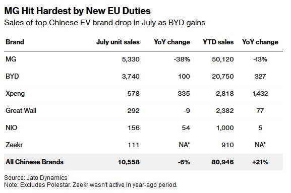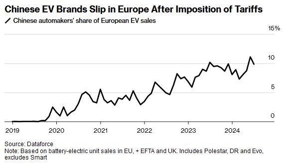 به گفته تحلیلگر و محقق دیتافورس (Dataforce)، برندهایی از جمله امجی متعلق به شرکت خودروسازی شانگهای و بیوایدی ۹٫۹ درصد از ثبت خودروهای برقی در منطقه را به خود اختصاص دادند که در مقایسه با ۱۰٫۲ درصد در جولای ۲۰۲۳ کاهش یافت. کاهش تقاضای کلی برای خودروهای برقی پس از اینکه آلمان (بزرگترین بازار خودروی اروپا) در اواخر سال گذشته مشوقها را حذف کرد، ادامه دارد.