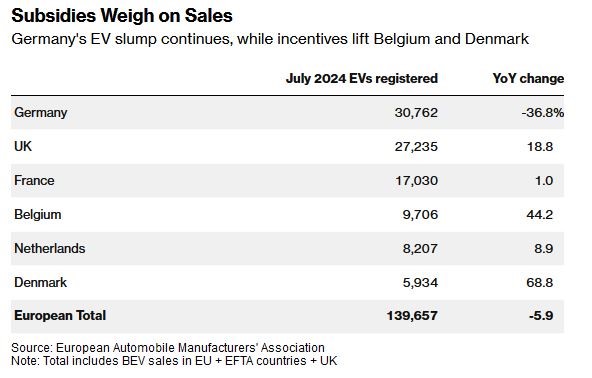 مشوقها یا فقدان آنها، همچنان نقش اصلی را در فروش خودروهای برقی ایفا میکند. بر اساس گزارش انجمن خودروسازان اروپا، فروش خودروهای برقی در آلمان طی ماه جولای ۳۷ درصد کاهش یافت و اکنون ۲۰ درصد نسبت به سال گذشته کاهش یافته است.