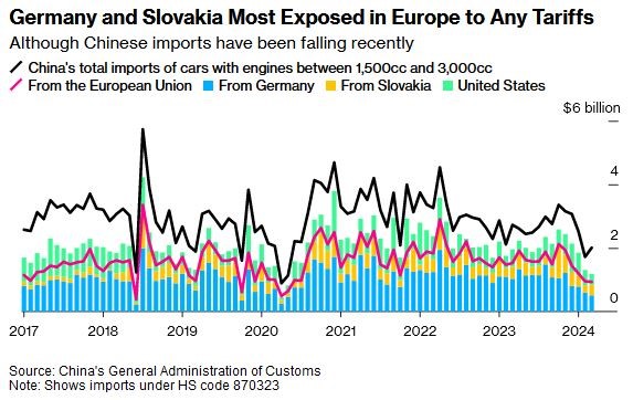 چین تهدید کرده که تعرفه خودروهای موتور بزرگ را افزایش خواهد داد و در اقدامی که به دو اقتصاد بزرگ اتحادیه اروپا یعنی آلمان و فرانسه ضربه می زند، بر نوشیدنی ها عوارض اعمال خواهد کرد. اتحادیه اروپا در سال گذشته ۷۳۹ میلیارد یورو (۸۰۶ میلیارد دلار) تجارت با چین انجام داد.