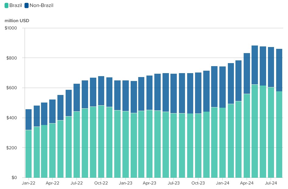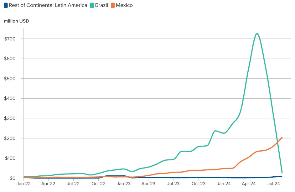 اما نکته جالب این است که صادرات EV به برزیل در ماه‌های اخیر کاهش شدیدی داشته، و در مقابل صادرات به مکزیک به‌شدت در حال افزایش است.