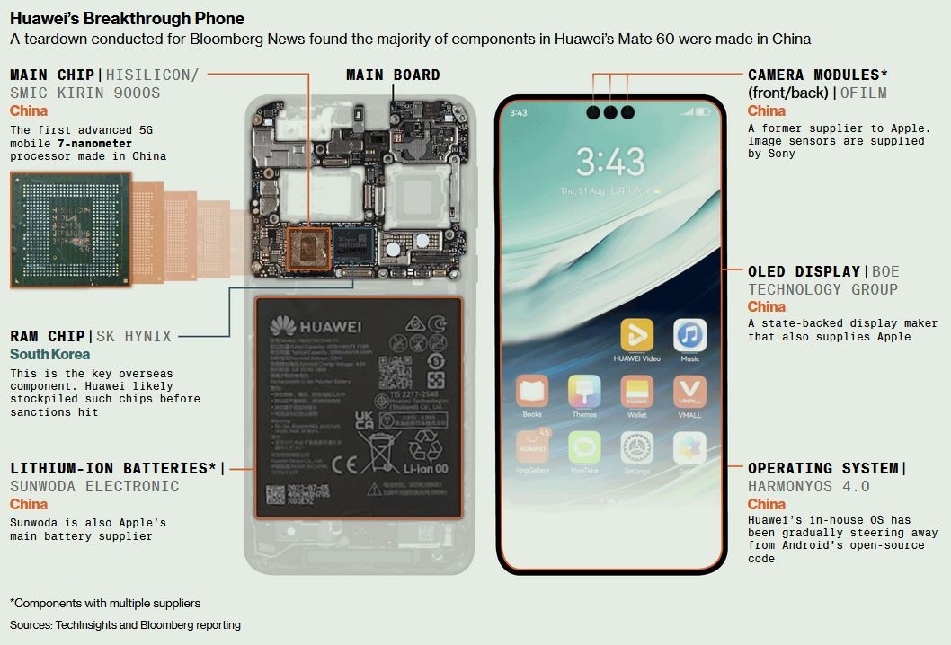 هواوی هرگز جزئیات فنی گوشی مذکور را فاش نکرد، اما با بررسی دقیقتر گوشی که توسط TechInsights برای بلومبرگ انجام شد، مشخص شد که این گوشی از پردازنده ۷ نانومتری پیشرفته SMIC پشتیبانی میکند. همین امر نشان میدهد که چین تقریباً پنج سال از پیشرفتهترین فناوریهای کنونی عقبتر است. هدف کنترلهای صادراتی اعمال شده توسط دولت بایدن در سال ۲۰۲۲ این بود که چین را حداقل هشت سال عقب نگهدارند.