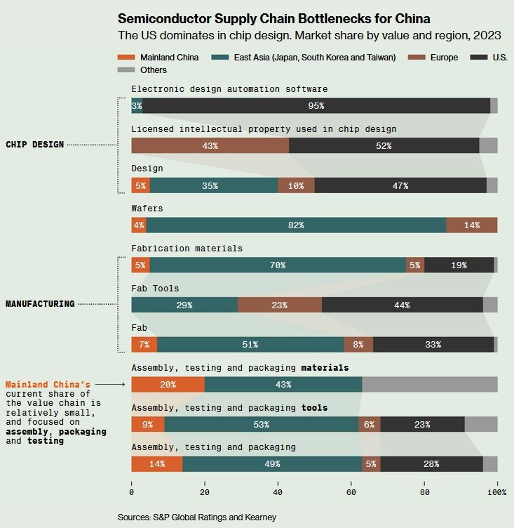 کلیفورد کورز، تحلیلگر S&P Global Ratings میگوید چین مجبور نیست در تمام مراحل زنجیره تامین نیمهرساناها به خودکفایی برسد. در عوض راه حل پکن، ایجاد جایگزینهای داخلی در آن چهار یا پنج مرحله از فرآیند است که ایالات متحده و متحدانش میتوانند منابع تامین آنها را قطع کنند. این بدان معناست که چین – و هوآوی – احتمالاً بر بخشهای متمرکزی مانند لیتوگرافی، تولید ویفرهای نیمه رسانا و اتوماسیون طراحی الکترونیکی یا EDA تمرکز خواهند کرد.