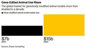 بازار جهانی حیوانات تغییر یافته ژنتیکی برای پژوهشهای زیستپزشکی در سال ۲۰۲۴ به ۱۵ میلیارد دلار رسیده، بیش از دو برابر رشد در کمتر از یک دهه. در حالیکه شرکتهای آمریکایی مانند Jackson Laboratory و Charles River برای سالها بر بازار حیوانات آزمایشگاهی کوچکجثه تسلط داشتند، دولت چین اکنون مستقیماً مراکز اصلی پژوهشی را تأمین مالی میکند. در کنار آن، شرکتهای چینی مانند Shanghai Model Organisms Center Inc.، Biocytogen Pharmaceuticals (Beijing) Co. و Guangzhou Huateng Biomedical Technology Co. در زمینه تولید و فروش حیوانات ژنویرایششده فعالیت دارند.